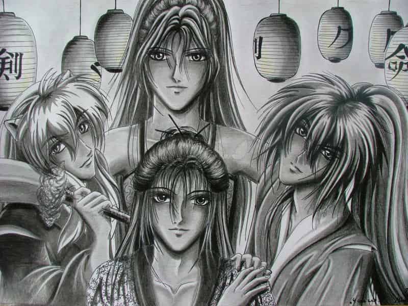Was ihr hier seht ist das Resultat von mindestens 15 Stunden Arbeit^^. Immerhin wieder auf DIN-A3 entstanden, und ich konnte auch einmal mehr die Finger nicht von meinem "s/w-Favorite-Style" lösen. Gibt diesem Gruppenbild doch irgendwie was Nostalgisches, irgendwie was von einer alten Fotografie, die man nach Jahren wieder in die Hand nimmt um sich an das, was drauf zu sehen ist, zu erinnern... *seufz* Eine schöne Vorstellung^^. Zu sehen sind übrigens (v.l.)Yasha, Aurinia-chan (oben), Madoka (unten) und der süße Kenshin^^. Es hat Spaß gemacht mal ein solches Gruppenmotiv auszuarbeiten. Ich hab viel Mühe rein gesteckt und ich hoffe, das kommt auch ein bisserl rüber und es gefällt dem einen oder anderen^^. Würd mich riesig freuen! (Und über Kommies natürlich auch...^O^)