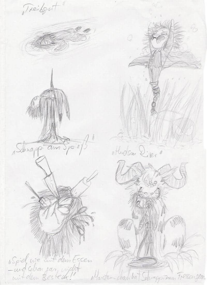 so, willkommen zum zweiten teil der beliebten „schnappis tausend tode“ – reihe! ^^ diesmal hab ich mich mit folgenden themen auseinandergesetzt: „treibgut“: seine leiche schwimmt im wasser. es ist ungewiss, ob der ertrunken ist oder ermordet wurde. „hudson river“: „nehmt ihn, bindet ihm einen stein um die knöchel und versenkt ihn im hudson river!“ idee nach einem running gag aus’m radio. „schnappi am spieß“: mal was anderes... kann auch gegrillt und zur hochzeit deines besten freundes serviert werden... ;) „monster-chan hat schnappi zum fressen gern“: wer erinnert sich noch an mein geliebtes schäfchen-monster??? eben das ist hier zu sehen, nachdem es eine weile mit snape... eh... „gespielt“ hat... sie hatten viel spaß miteinander! O,ô „spiel nie mit dem essen – und schon gar nicht mit dem besteck!“: nanü? wie kann denn DAS passieren? da war jemand aber SEHR unvorsichtig! XD mein persönlicher fav... zusammen mit dem monster-chan. ich stehe nunmal auf gabeln und elfäugige monsterchen... ^^