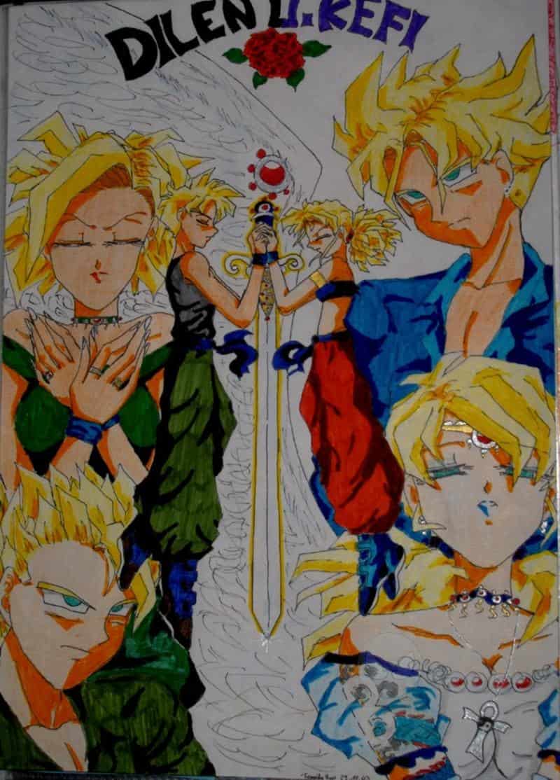 Dieses Bild ist ein Saiyajin Bild (wie man unschwer erkennen kann, alle SSj- Form) aber die Hauptpersonen sind diesmal in der mitte mit dem riesigen Schwert die Kinder der jeweiligen Eltern aussen, Kefi und Dilen...(die auch insgeheim ein Paar sind)