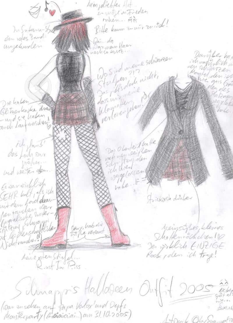 das kommt jetzt aber verdammt spät... und wenn man sich das datum des bildes anschaut, dann isses jetzt sogar noch später... ich habs vor über zwei monaten gezeichnet, aber ich bin ja so ein ei, was meinen scanner angeht... -.- mir war halt mal danach, mein halloween outfit vom letzten jahr zu zeichnen, keine ahnung wieso. ich weiß bis heute nicht, was das überhaupt darstellen sollte. ich hatte mir den mund und die augen noch schön schwarz gemalt und mich dann so geschminkt, dass es aussah, als hätte ich mich gerade an etwas sehr blutigem gelabt... O______o leider ist das muster meines „schottenröckchens“ beim colorn ziemlich in mitleidenschaft gezogen worden, so dass man es kaum noch richtig ausmachen kann. menno, dabei hab ich mir solche mühe gegeben. war ganz schön schwer, das vom original auf die kleine zeichnung zu übertragen! XP tja, was soll ich noch dazu sagen?? alles „wichtige“ steht eigentlich in der skizze selbst. tut mir leid, aber ich liebe es, meine skizzen vollzuschreiben... ^^; wer sich’s antun will, kann sich das bild ja in originalgröße anschauen und das alles lesen. puh, da waren meine haare noch so kurz... und da hatte ich noch meine stiefel... und meinen geliebten hut... ;_____;