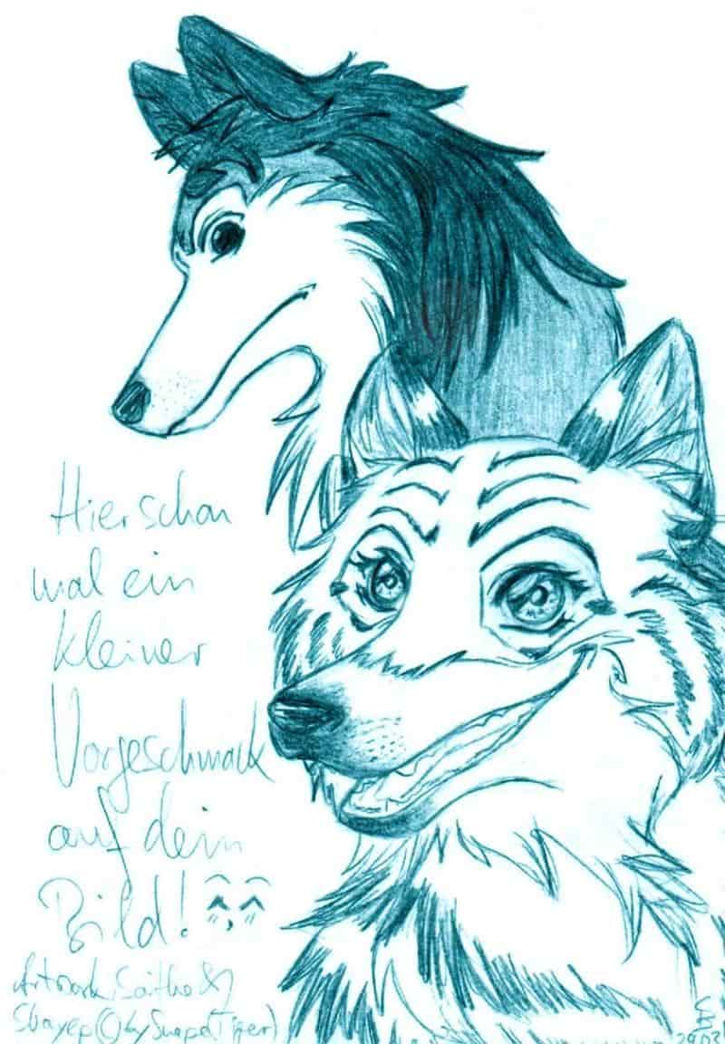 das ist die NEUSTE skizze, die ich habe!!!! heute (29.03.) hat mir nighty eine sms geschickt, von wegen, sie hätte das netzteil für den kontakt zum internet verschmort. ich kann mir zwar immer noch nicht vorstellen, wie du das geschafft hast, meine liebe, aber immerhin war das endlich der letzte anstoß, den ich gebraucht habe, um dir einen brief zu schreiben. ^^ ok und da dein bild noch immer nicht fertig ist (steht ja im brief), hab ich gedacht, dass ich dir zumindest ne kleine skizze mitschicke. hier sind also klein saithe und shayep zu sehen. von letzterem krieg ich zur zeit einfach nicht genug! O/////o eigentlich sollte ja ne grinsende nighty in den hg, aber shayep hat mich fast schon ANGEFLEHT, ihn doch hinter SEINE saithe zu zeichnen. na gut, das aber auch nur, weil du so schön artig warst... -.- meine kleine tigerwölfin guckt ein wenig dummdreist, aber eigentlich mag ich sie. shayep ist sowieso knuffig! ^^ boah, wie der sie anguckt, ICH WILL AUCH!!! XD endlich kann ich meine wölfe wieder einigermaßen gescheit zeichnen, ich hab ja grad ne zeit durchgestanden, in der ich sie GAR nicht zeichnen konnte, in der ich überhaupt nichts hinbekommen habe. ob greif, mensch oder wolf, alles sah einfach nur wie puh-puh aus! O____o noch ein grund dir zu danken, mein drache! ich bin mal so dreist und behaupte, dass ich dank dir wieder zeichnen kann! ^^