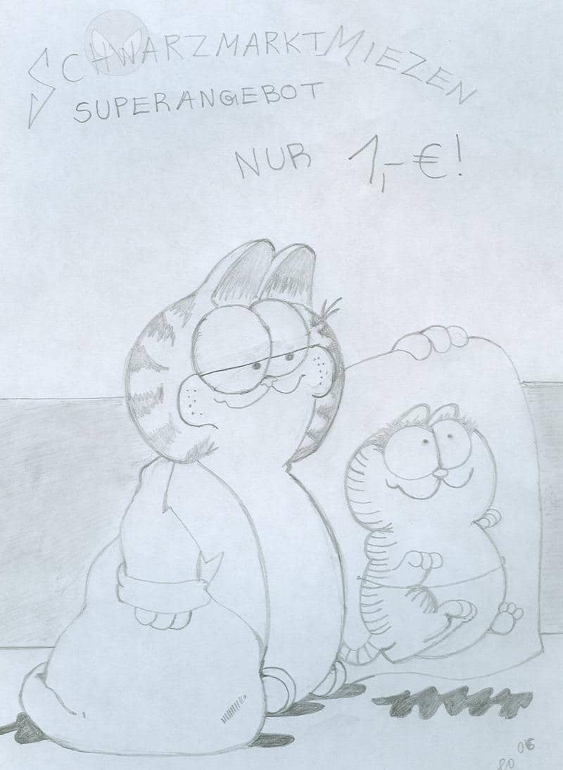 Und hier kommt eine weitere zeichnung von Garfield! Garfield versucht Normel auf dem Schwarzmarkt zu verkaufen, weil er ihn nicht mehr erträgt! Diese zeichnung habe ich meiner Schwester geschenkt, weil sie Normel, das Kätzchen, so dick und süß fand.