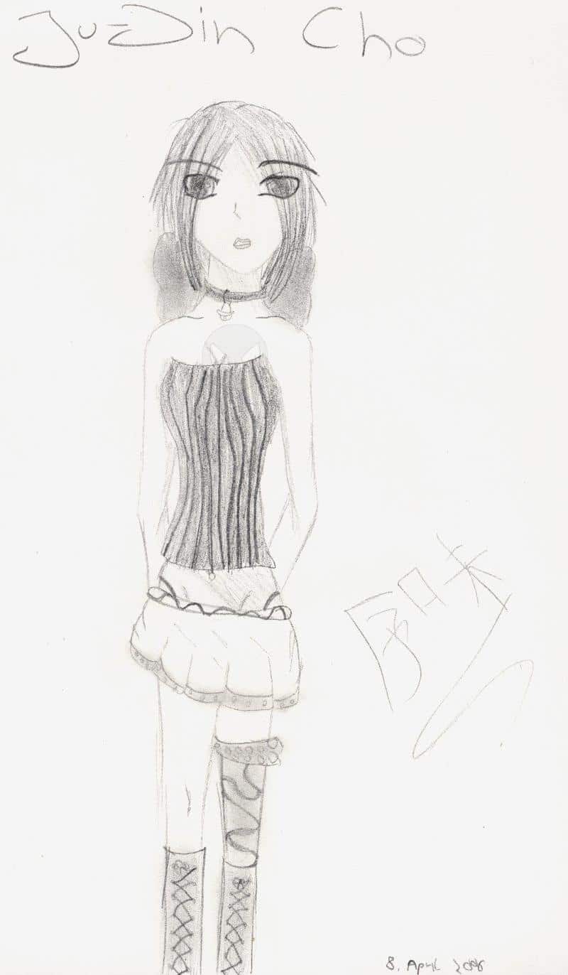 Das is Ju-Jin Cho(die,die mir den namen gab xD).Irgendwie erkennt man sie aber nicht wirklich,wie ich finde.Die Corsagè(nennt man das so?) ist wohl Moulin Rouge-Einfluss und Die Schleife am Hals ist Tokyo Mew Mew-Einfluss.Bei dem kurzen Rock hab ich mich dann von Judith Park inspirieren lassen,da solche Röcke auch typisch für Ju sind....
