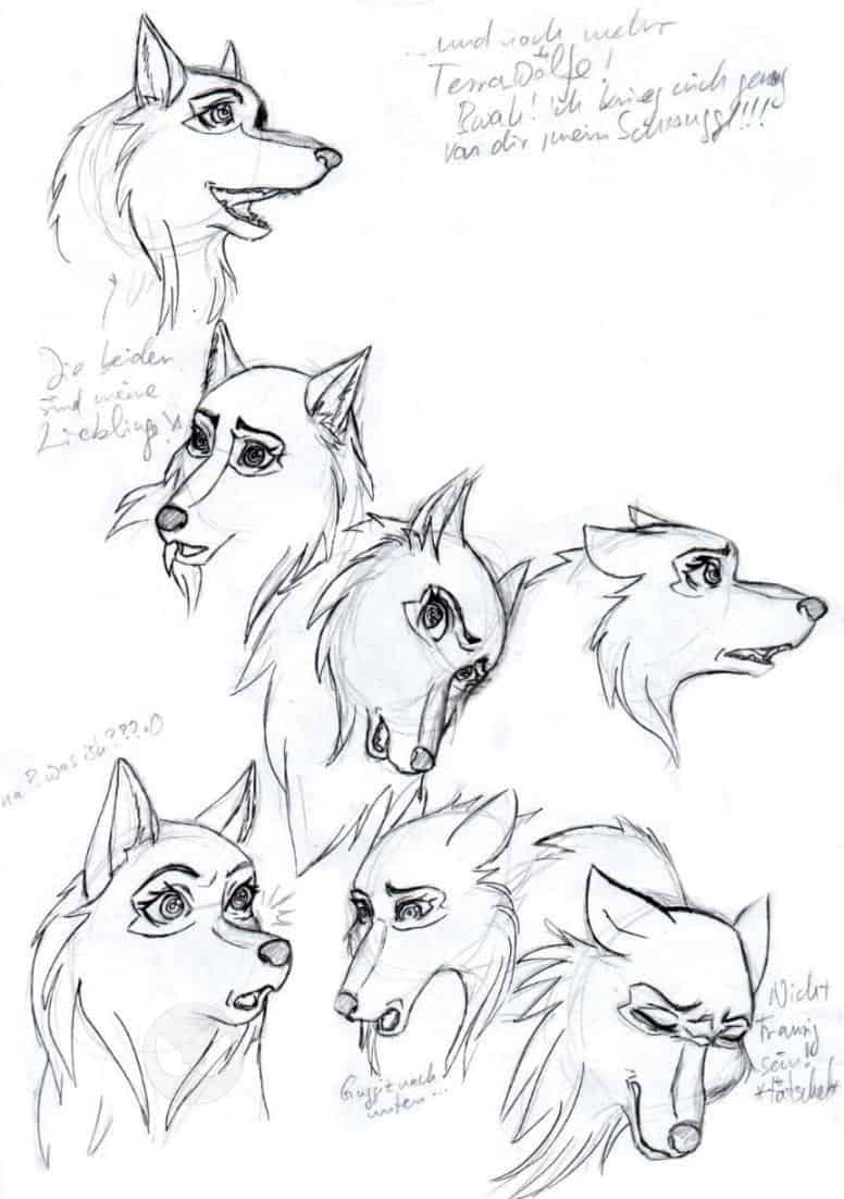 die zweiten skizzen meiner weißen wölfin im comic stil. ich hab versucht, verschiedene gesichtsausdrücke einzufangen. dabei hab ich eines total vermasselt, deswegen ist rechts oben auch so ein weißer fleck. XD die beiden links oben sind meine lieblinge. ich mag terraleins augen. überhaupt sieht sie jetzt besser aus, als auf den ersten skizzen, was auch der grund dafür war, dass ich zuerst diese skizzen hier getuscht habe. auch die werden irgendwann (...) noch gecolort... da konnte ich noch wölfe zeichnen! O.o
