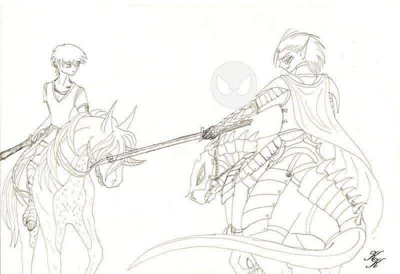 kaminari und draco gehören zu den letzen drachenblütern die in dieser welt leben, alle anderen magischen wesen sind vor langer zeit vor den menschen geflohen... die wenigen die zurückgeblieben sind werden von den menschen, genauer gesagt von den selbsternannten drachenjägern gnadenlos verfolgt. dieser drachenjäger hier hat im kampf mit einem der letzten großen drachen seinen linken arm verloren, als ersatz schuf ihm ein schwarzer magier einen arm aus dem blut des erschlagenen drachen (deshalb ist er mit schuppen besetzt). der arm ist unempfindlichen gegen jede art klinge, mit ihm führt er auch das schwert "blutklinge", welches seinen anmen nicht von ungefähr hat, denn es ist aus dem bluteisen von tausenden magischen wesen geschmiedet...