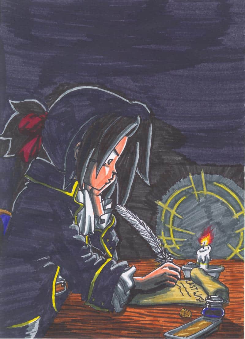 Die Idee kam mir, als ich meine Schreib Feder betrachtet habe....Ich habe mir vor kurzem eine Solche Gänsefeder geholt, weil ich schon immer mit so etwas schreiben wollte. Und dann ist mir eines Abends aufgefallen, das ich auch schon ein solches Tintenfass habe. Nya, da waren früher Halbedelsteine drin....ich hatte es auf einem Weihnachtsmarkt gefunden ^^’