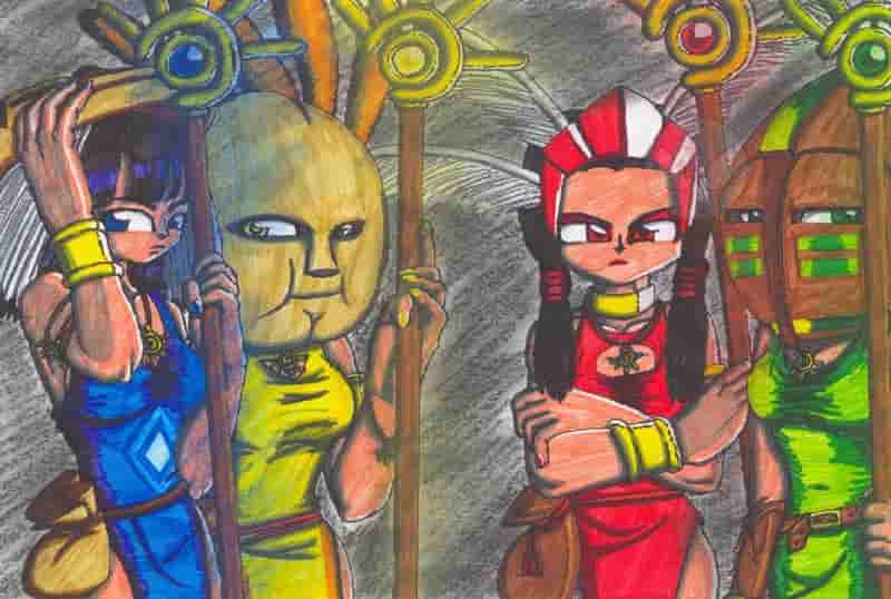 Nya, das sind die Schamaninnen von dem PC-Spiel Populous. Die blaue ist diejenige, die man selbst spielt, und die anderen sind stellvertretend für ihre Stämme (Gelb für Chumbara, Rot für Dakini und Grün für Matak).Es ist echt ein witziges Spiel ^^ hab alle Level geschafft dabei!Aber ich finde, die blaue sieht unter der Maske ein wenig wie Nico Robin aus One Piece aus.