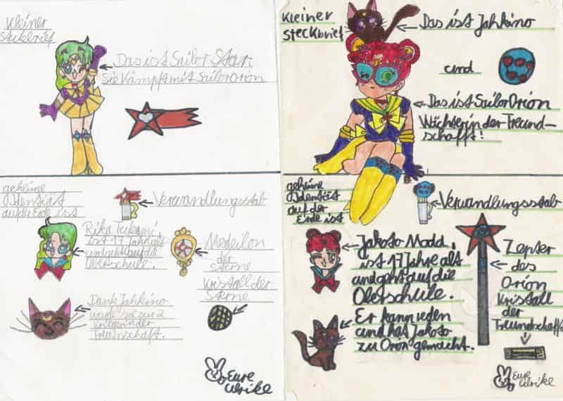 die beiden bilder hab ich mal beimausmisten gefunden.das habich mal gezeichnet (ok mehr abgepuscht xD) als ich jünger war ungefähr 10 oder so.das sind sailor orion und sailor star boha sind die beiden mies xD sailor orion sieht aus wie bunny mit abgeschnittenen haaren xD und bei sailor star hab ich mal einfach haare drangesetzt sieht aus wie ne schlechte haarverlängerung xD...ich hoffe ihr könnt meine krakel schrift lesen ^-^".sailor orion gibt es immer noch und vlt. lad ihc mal die verschiedenen versionen von ihr hoch und danndie endversion(die ich richtig schön finde wenn ich se mal finden würde xD) naja freu mich auf eure commis sayonara de darkneko
