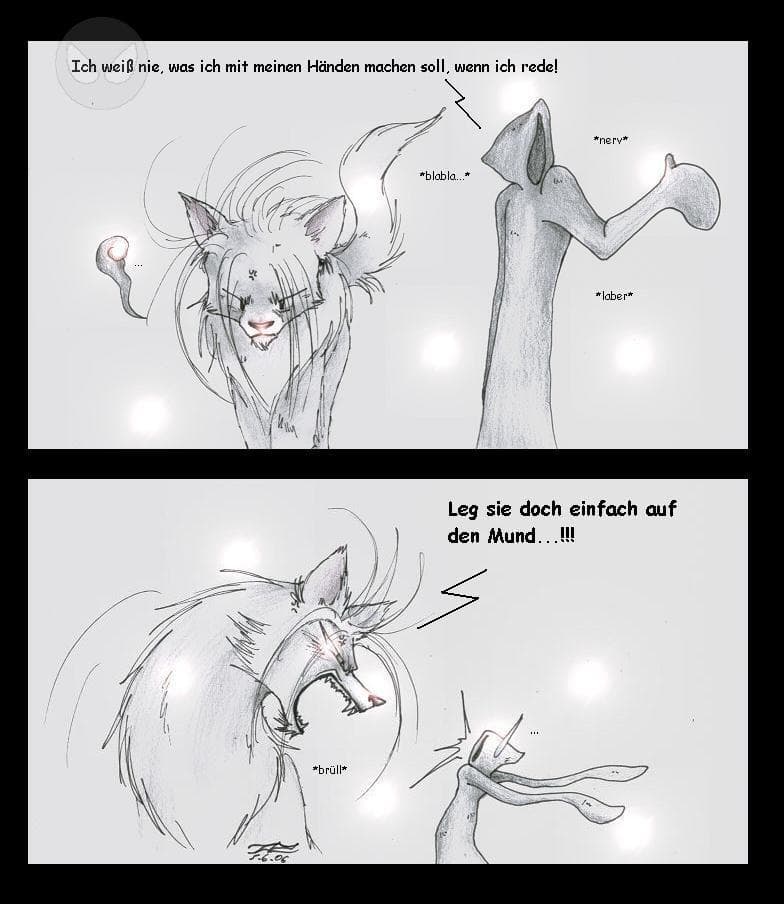 naja, also hier hätten wir luzi und neotu als wolf auf dem rückweg von einem kampf gegen einen feind. luzi redet wie eine furie auf neotu ein und nervt diesen zu tode. bis er dann auf ein thema kommt, wo dem wolf der kragen platzt und er sich nicht mehr zurückhalten kann...XD