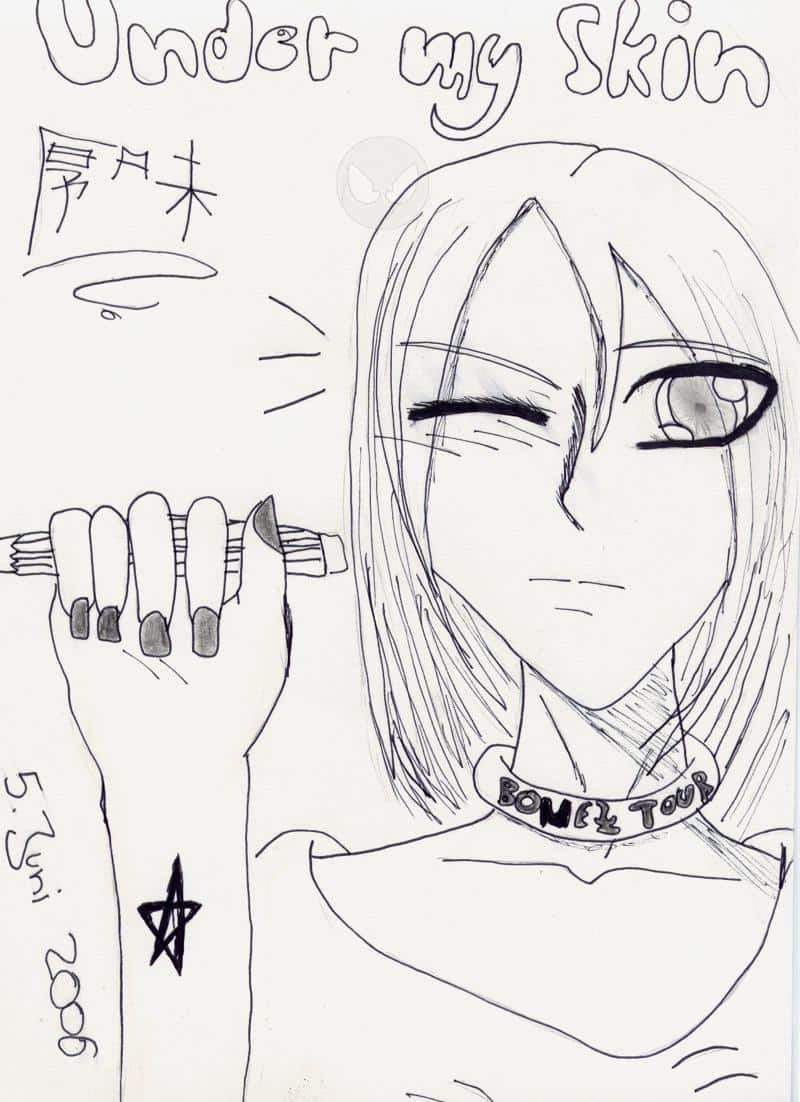 Jaaahahaha.....Mein erstes Bild zur "Avril Lavigne-under my skin"-reihe!!!!Die hand hab ich diesmal komplett bei mir selber abgeguckt.Auf dem Halsband steht "Bonez Tour",weil Avril die Tour zu dem album so benannt hat,und,wer hätte es gedacht,weil knochen unter der haut sind.hahahaha......(hab die under my skin-version mit dvd wo ausschnitte von der tour drauf sind).