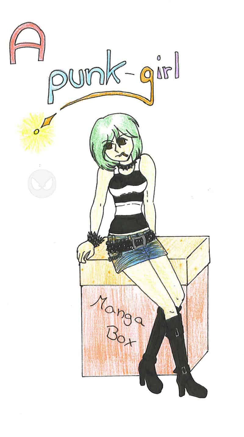 Das soll ein Punk-Mädchen sein, ich hatte keine Ahnung worauf sie sitzen soll und deshalb hab ich einfach eine Mangabox hingemalt.