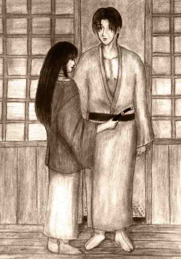 Die Szene, die ich hier darstellen wollte, spielt im letzten Teil des Manga (dem "Irdische Rache" Handlungsbogen) als Megumi, nachdem sie nun mit Aoshi zusammengearbeitet hat um Enishi zu finden, vor dem Kamiya-Dojo auf ihn trifft (Die Szene gibt es im Manga natürlich nicht). Sie gibt ihm dort den Dolch zurück, den sie benutzt hatte um seinen damaligen Chef Kanryu zu töten und den Aoshi ihr gegeben hatte um Selbstmord zu begehen. Jetzt geht sie allerdings Kenshins Weg und will für ihre Sünden sühnen indem sie lebt und nicht indem sie sich selbst oder irgend jemand anders tötet. Deshalb fand ich es passend wenn sie jetzt den Dolch weggibt.
