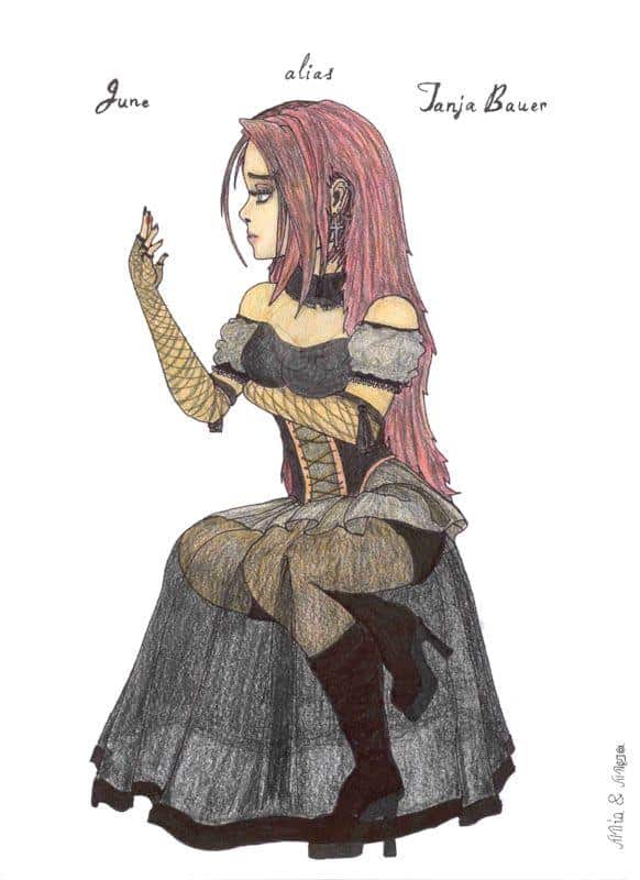 Aussehen: Sie hat rote, lange Haare mit schwarzen Stränen. Außerdem trägt sie Gothic klamotten. Was Ketten, Make up und so weiter angeht, lasst eurer Phantasie freien Lauf^^