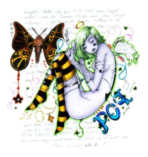 So langsam geht mir mein Vorrat an Bildern aus XD""" (Hatte mir vorgenommen hier nur das Gute zu veröffentlichen und nicht wie bei Mexx jeden Schwachsinn *hust*) Demnächst müsst ihr dann halt warten bis ich wieder etwas Neues gemalt hab ^-^"""" Aber da ich durch mein letztes Bild (. subtiles leben... .) wieder aus meinem Kreatief aufgetaucht bin dauerts bestimmt nit lange Ä_Ä Na ja, komm ich mal zum Bild: Der Text dahinter ist aus ein paar Lyrics von Staubkind zusammen gebastelt da ich die Verse einfach nur Liebe. Tolle poetische, ausdruckstarke deutsche Musik *lach* wenn mans mal so sagt. Durch dieses Bild entstand mehr oder wneiger meine "poppige" Phase mit dem quietschigen Farben xD~ Des Wuschelflügelvieh soll übrigens eine Motte sein xD" hab mich mit der Musterung der Flügel mal so gar nicht an die Realität gehalten und mir etwas ausgedacht. Irgendwie mag ich das Bild Ä_Ä Davon gibts auch noch eine ungecolorte Version die ich mit PS Pink eingefärbt hatte. Diese find ich aber schöner und weniger aufdringlicher. Ist glaub ich so 4 - 6 Wochen alt. Und wegen den Fehlern xD" Die kenn ich alle schon reichlich *lach* Da ich einfach keine vollen Copics mehr hab musste ich so frekige Farben nutzen was mich so auf den Trip brachte xD" (Ist das\'ne lange Beschreibung ^^""" *jetzt irgendwie unbedingt Staubkind hören muss*)