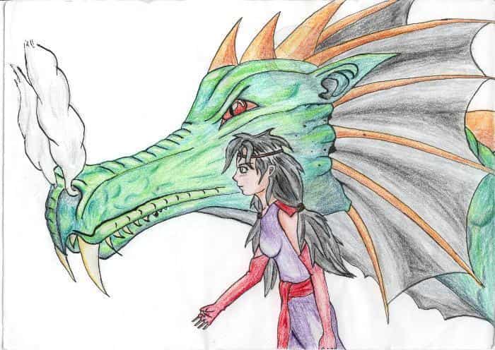 Aryn, die Drachenbeschwörerin aus meinem ersten Manga Sunchild, mit ihrem Drachen Sae...