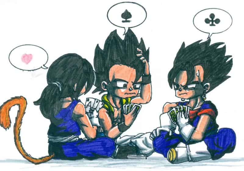 Hehe…Hier spielen die drei Typen, deren DNA aus Kakarott und Vegeta besteht, Karten ^^ >Mau mau. Gotan (ganz doll links) ist der einzige, der nur einen Geist in sich trägt, deshalb gewinnt er (entscheidungsvermögen).