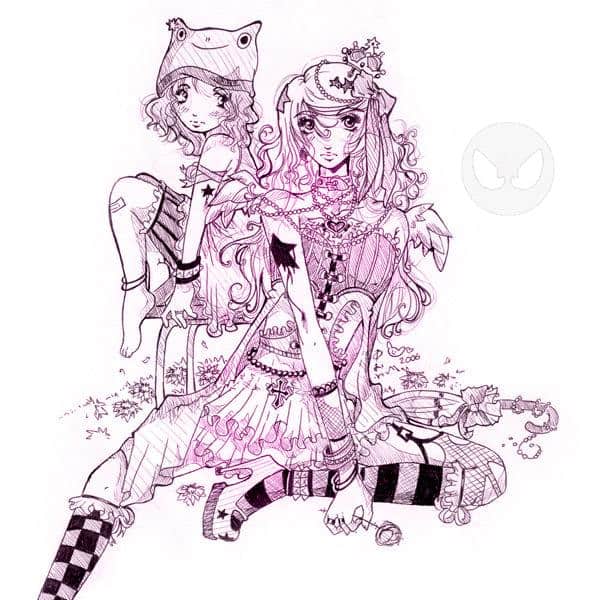 Ach ja, ich wundere mich über mich selbst >D Früher habsch ja nur "richtige" Bilder gezeichnet und so aufwendiges wie hier und bin dann irgednwie langsam ins Schräge abgedriftet XDDD Daher finde ich es verwunderlich ein solche Motiv gezeichnet zu haben *_* Hab bestimmt seit über einen Jahr keine Gothic Lolitas mehr gezeichnet wo ich mich doch damals darauf beschränkte ^^""" Ich saß etwa 4 - 5 Std. an dem Bild (bis 3 Uhr nachts ^^")und habe es mit Copic Multiliner gezeichnet (davor natürlich mit Bleistift XD). Hatte eigtl. erst aus Langerweile angefangen und dann wurds immer mehr und ich habe noch nie im Leben ein Kind gemalt XD"" Echt jetzt *lach* Und finde dafür ist sie gar net sooo übel geworden Ä_Ä~ Hach ja, mir ist wieder eingefallen wie ich es liebe mir Kleider auszudenken =D
