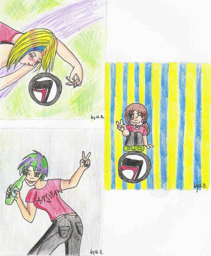 (deswegen auch das antifaschistische aktion logo ^.^) und die leute mit den ich da war machen selber wein und die haben vergessen ihre flaschen zu etikettierenund da hab ich welche gezeichnet es ist keine schrift drauf weil ich schriften nicht kann und die jemand anders drauf machen sollte aber im ganzen stress haben wirs einfach vergessen xD und deswegen hab ich die noch xD die pose von der blonden und der punkerin hab iach aus der animania(hat ich mit)weil ich absolut kein plan hatte was ich für posen zeichnen sollte sind aber abgemalt nicht gepauscht!!! naja ist ja auch egal ich hoffe ihr mögt sie ^.^