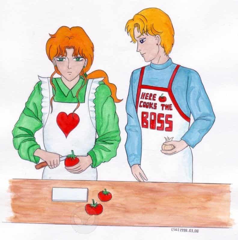 Das Bild ist auch eine Illustration zu meiner FanFic "Tears of Crystal". Jadeite habe ich kurzerhand zu einem fähigen Koch erklärt (wen es wundert, wo er doch in der Serie gewisse chauvinistische Tendenzen gezeigt hat - ist doch klar, dass er als Mann besser kochen kann als ´ne Frau, weshalb gibt es denn fast nur Starköche und und kaum Starköchinnen? XD). Auf jeden Fall hat Kunzite ihn dazu verdonnert, Zoisite das Kochen beizubringen, was letzteren nicht wirklich mit großer Begeisterung erfüllt hat.