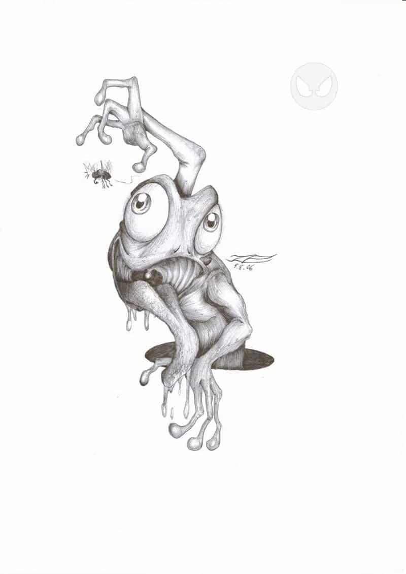ein bild das als kritzelei anfing und dann doch zu mehr oder weniger was wurde ^^. keine ahnung die idee kam einfach so und man weiß auch nich wirklich was es sein soll; frosch oder chamäleon...jedem das seine ^^. hoffe er gefällt euch.