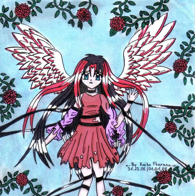 Ja, is der Titel nich einfallsreich? XD Ich war zu faul mir einen besseren auszudenken...Der Scanner hat die Farben verhunzt. Besonderst die Hautfarbe, die sieht jetzt total blass aus. ~.~ Und irgendwie verschluckt der Scanner die Schattierungen immer. Nach dem scannen sieht man die kaum noch. >.< Die Hand sieht Scheiße aus, und bei dem anderen Arm sieht es aus als wenn die Hand fehlt. XDDD Die Stengel von den Rosen sehen so fett aus. XD Ich musste die mit Filzstift colorn, weil ich kein passendes Neopiko-Grün hatte. >.> Und er eine Flügel is kleiner geworden.*Seufz* Diese ganzen Fehler... Ich glaub das is erstmal alles was ich dazu sage. *Scanner wegkick*