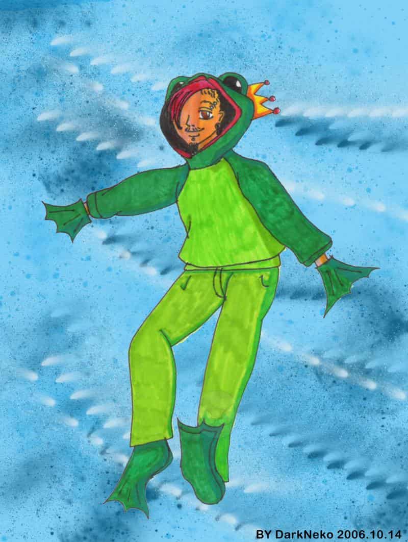 so ihr süßen ein neues bild von mir es soll meinen neuen lebensabschnittsgefährten darstellen ^////^ warum als frosch? naja dask amm so ich habe ein tshirt da steht drauf"you have to kiss many frogs to find a prinz" und er meinte dazu "ach ich bin kein prinz ich bin ein frosch" das fande ich so süß das er ab da mein froschprinz ist ^___^ zu dem bild:ich habe seit längeren mal weider mit filzstiften gezeichnet aber leider waren die schon so ausgetrocknet das die colo so unsauber geworden ist =( dafür finde ich den hg richtig schön ^___^ ich hoffe ihr mögt das bild in diesen sinne mata ne and have a nice day eure DarkNeko ^~^