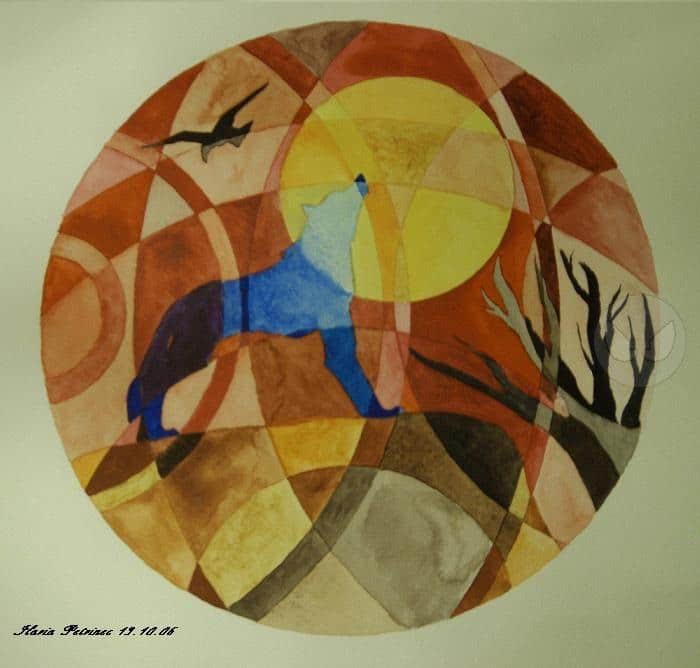 hier mal ne aquarellarbeit in A3...das hier war allerdings ne freiwillige arbeit. sie soll einen wolf darstellen der bei vollmond heult...meine mutter hat, als sie das bild gesehen hat, gefragt: was ist denn das für ein schmarrn? (anmerkung nebenbei: sie hats nich erkannt...) naja ich bin kurz darauf halb verzweifelt weil ich angst hatte, der lehrer würds nich erkennen...also hab ich das bild noch nich abgegeben. tja, ich schicks trotzdem her; vielleicht gibts ja einen "picasso fan" XD