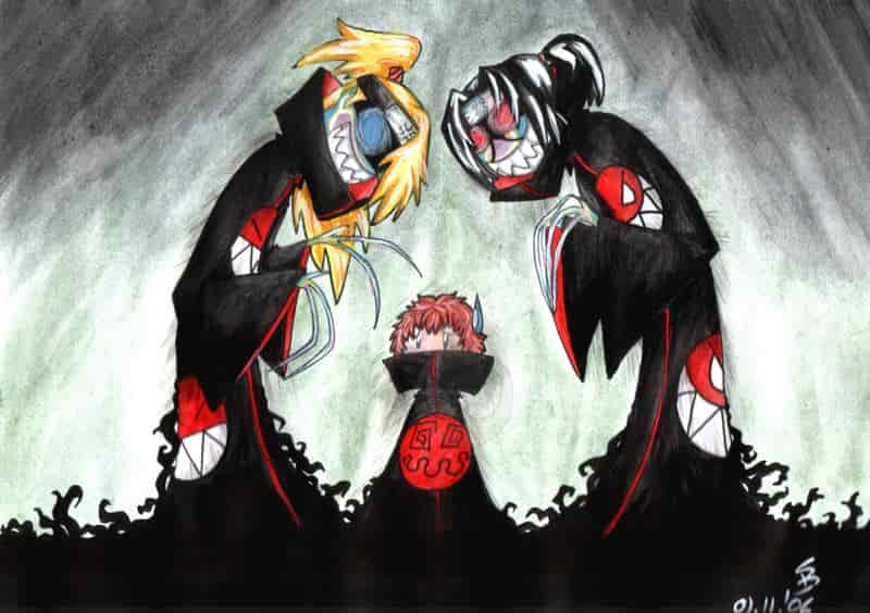Charactres © by Masashi Kishsimoto, Artwork © by Sev. Zwischendurch mal eine kleine Kreta Pause und ein kurzer Kommi auf Deutsch. Sorry für die Verspätung, es hat lange gedauert, aber hier ist mein Halloweenbild und ich wünsche damit nachträglich allen die ich kenne frohe Halloween! ^^ Gewidmet ist es natürlich Poff und unserem Saso, der mich erst auf diese Idee gebracht hat. Tschuldigung, Kleiner, but we ARE teh Tallest and u are our little invader… ^^ Dargestellt sind (von links) Deidara, Sasori und Itachi aus Naruto. Wieso, müsst ihr nicht verstehen. Und JA, sie SOLLTEN so verkrüppelt aussehen, die Augen SOLLTEN leuchten (mehr oder weniger) und die Farben gehören auch so. Es gibt noch eine dilettantische Compicolo, die ich vorab gemacht habe, um zu sehen, ob die Farbwahl durchführbar ist, falls es jemanden interessiert. Ansonsten verabscheue ich mich mal und setz mich an neue Arbeiten. Man muss die Ferien doch ausnutzen! ^^