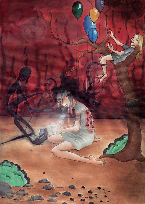 oh gott X_X entschuldigt die wellen im papier <_< kam von der tusche im bg ~.~ müll.. naja die büsche sind übrigens deshalb so "anders" von der farbe als der rest da... das leben ein einziges Theaterstück ist, wir sitzen nur zu weit weg um die ganzen dinge zu sehen die vor uns versteckt werden...