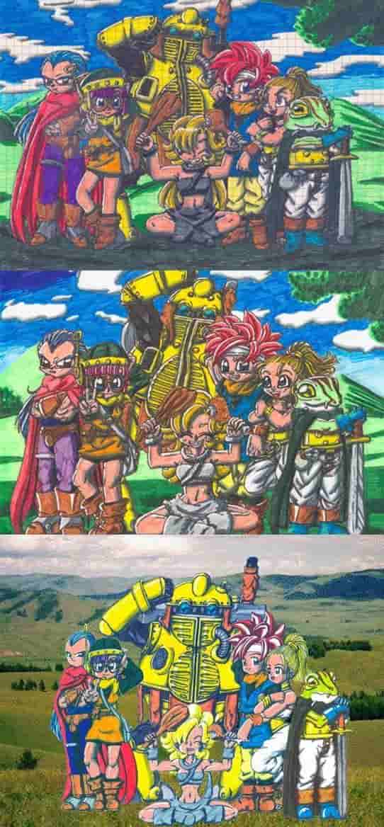 Das ist das Erinnerungsfoto von der Chrono Trigger Gang. Normal ist Magus ja nicht dabei, aber da es eben die Möglichkeit gibt, ihn ins Team zu wählen, wähl ich ihn auch hier rein, obs ihm passt oder nicht! Und hier sind 2 Anläufe zu sehen. Das erste hab ich ca. 2002 gemacht, das danach ca. 2004 und das wohl am Besten aussehendste ist ganz frisch im Jahre 2006! Das Neuste habe ich aber auch vom Zeichenstil auch eher an meinen ebenfalls neusten Doujin angeglichen. Den Doujin gibt’s auf animeMANGA zu sehen. Ihr könnt ihn nicht verfehlen, weil es der einzige Chrono Trigger Doujin ist.