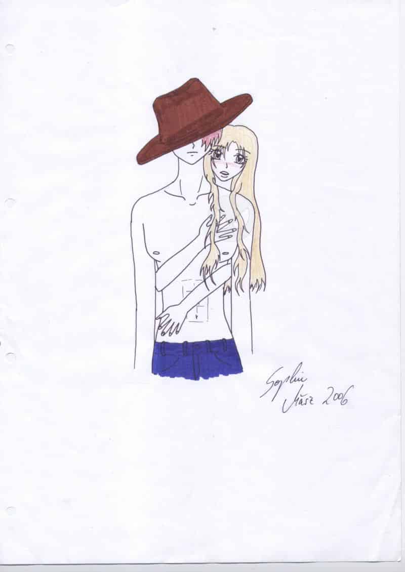 Aaaah, ein selbst gezeichnetes Bild mal wieder. Das hab ich im Unterricht fabriziert und da ich zu dem Zeitpunkt noch keine Typen zeichnen konnte (zumindest das Gesicht), hat der nen Hut vorm Kopf ^^ aber ich finde, das hat irgendwas ^^
