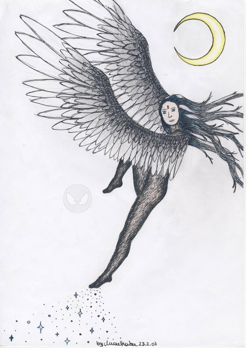 das ist der Engel der Nacht. Er heißt so weil er jeden Abend über den Himmel fliegt und die Sterne dort vereilt. würde er nicht fliegen würde es am himmel keine sterne geben und der himmel wäre dunkel. danke tobias für deine tuschestifte.