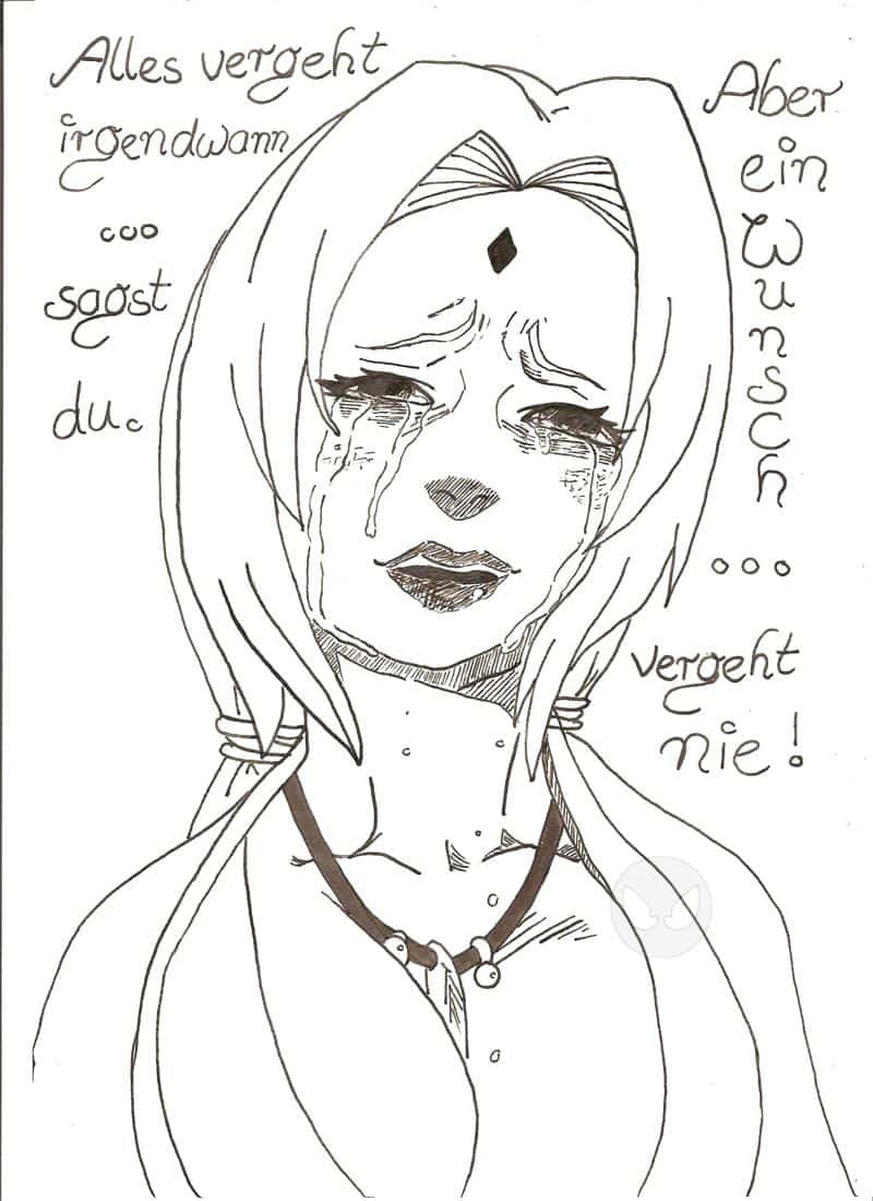 Hmm.. mich hat das iwie berührt, und deshalb hab ich das Bild aus dem Manga abgezeichnet und anschließend bin ich nomma mit Tusche drüber gegangen. Iwie bin ich auch ein bisschen stolz darauf, weil ich den ersten Versuch damit verglichen hab und das schon um Welten mehr nach Tsunade aussieht! Trotzdem find ich andauernd Fehler >.< Hähäh.. seid einfach nicht so streng mit mia, ja? *liebschau* Bitte um gaaaanz viele liebe Kommis!! ^o^