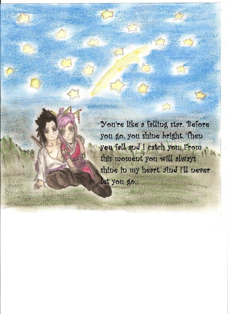 Jahha.. ich war am Anfang eigendlich ganz zufrieden damit, weil ich mir die Pose und so auch mal selber ausgedacht hab, und mir auch mal eine etwas bessere Idee gekommen war, aber die Betonung liegt wie gesagt auf WAR! >.< ich kann es einfach nicht fassen, wie schrecklich das alles aussieht ! ~.~ Meine Bleistiftzeichnung sah iwie deutlich anders aus T~T Mit der Auarellfarbe hat das anscheinend nicht wirkjlich so geklappt, wie ich es wollt, und da ist dann das bei rausgekommen. Die Augen von sakura sind total verwisch, wiel ich die noch schwarz umranden wollt, und dass dann aber wieder entfernt hab. Sasuke hab ich auch verunstaltet.. der sieht iwie zu freundlich aus, und die Augen sind so mega kindlich... ja.. nomma tschuldigung an alle *hähähä* Ich hatte lange mit der Pose zu Kämpfen und dann sowas.. ich versuch das alles vielleicht später nomma. Der HG ist mit Kreide, da ich das nicht acuh noch mit Aquarell verunstalten wollt.. japs.. demnächst gibts noch eine Bleistiftskizze.. fürn Vergelich *wegspringz* *hofft trotzdem auf den einen oder anderen Kommi*