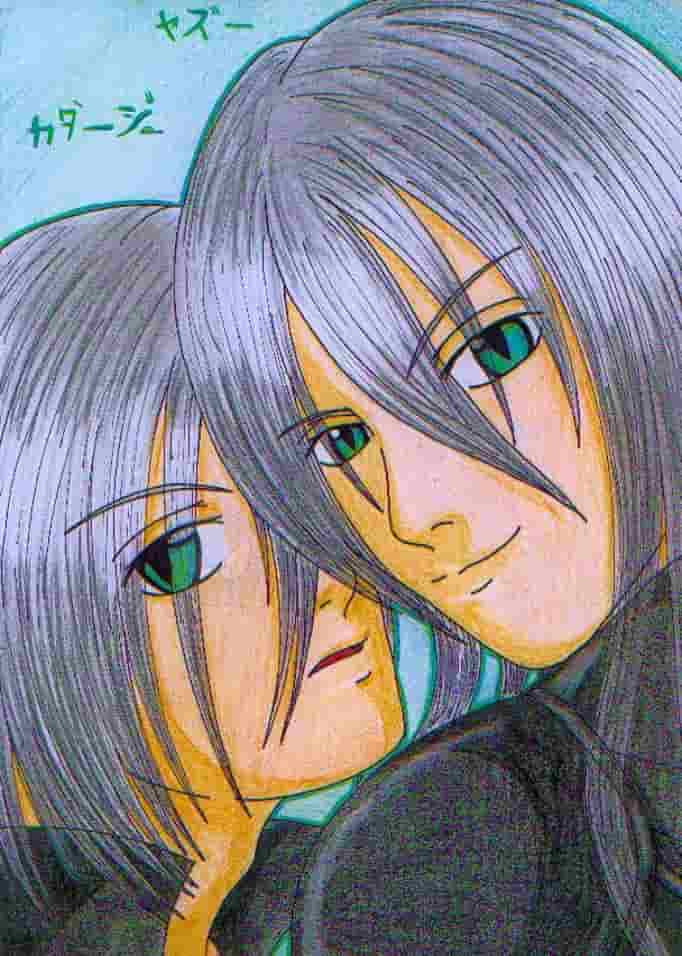 Ansonsten...mein Scanner hat die Farben verfälscht, daher wirkt die Hautfarbe viel zu dunkel und auch das schwarz der Mäntel wurde verändert, so hässliche Kleine grüne Punkte überall >.<